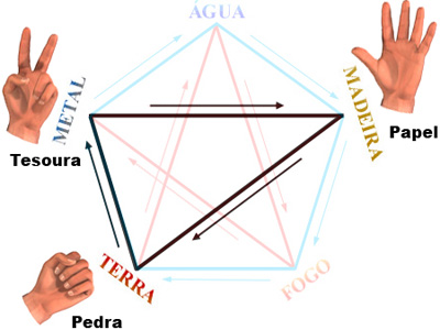 Trata-se de uma versão simplificada dos 5 elementos chineses e suas relações de Contenção / Destruição, só que neste caso, foram removidos o Fogo e a Água, restando a TERRA (Pedra), o METAL (Tesoura) e a MADEIRA (Papel).